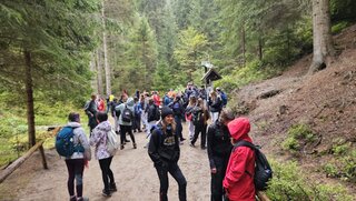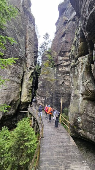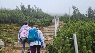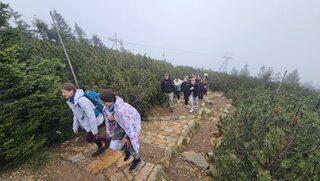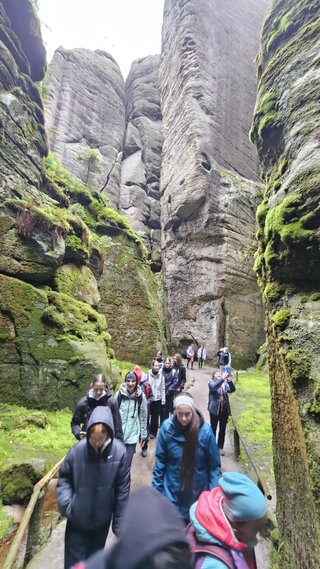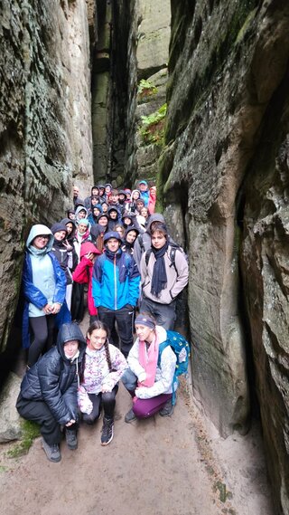 V dňoch 30. 9. - 1. 10. 2025 sme boli na výlete na Snežke, najvyššom vrchu ČR a v Teplických skalách. Hore na Snežku sme sa do pol cesty vyviezli lanovkou a dolu zišli pešo. Na vrchu bola hmla a zima, takže výhľad bol tajomný a trochu rozprávkový. Cestou dole sme kráčali aj po tme a hmle a museli sme si svietiť baterkami, čo bolo miestami strašidelné. Ďalší deň sme sa vydali do Teplických skál, ktoré nás očarili svojimi úzkymi chodníčkami, skalnými bránami, vežami a malými jaskyňami. Hoci tam trochu pršalo, príroda pôsobila čarovne. Počas výletu sme sa veľa nasmiali a užili si spolu krásne chvíle. Aj sme sa unavili, ale každý krok stál za to. (S a K, 3.C)