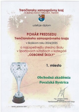 Obchodná akadémia v Považskej Bystrici sa na výstave stredných škôl STREDOŠKOLÁK - hrdina remesla už po druhý krát umiestnila na 1. mieste v športových súťažiach. Toto podujatie sa konalo 6. a 7. 11. 2025 v Mestskej športovej hale v Trenčíne a súčasťou prezentácie stredných škôl v zriaďovateľskej pôsobnosti Trenčianskeho samosprávneho kraja bolo aj vyhlásenie najlepších škôl vo vedomostných a športových súťažiach za školský rok 2024/2025.